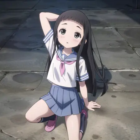 main: long hair,black hair,black eyes,bangs,blunt bangs,blue eyes,blush,