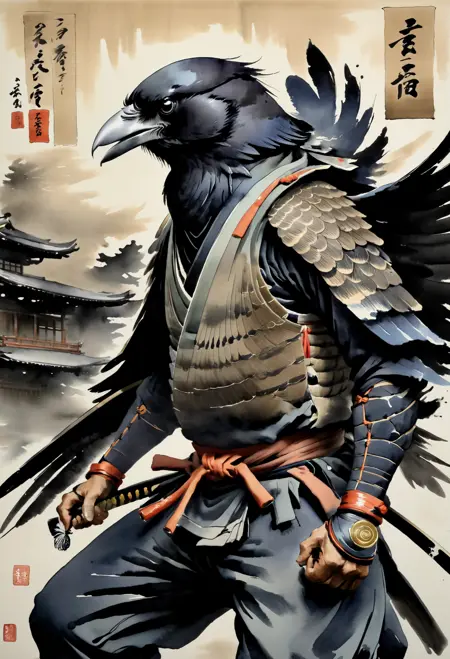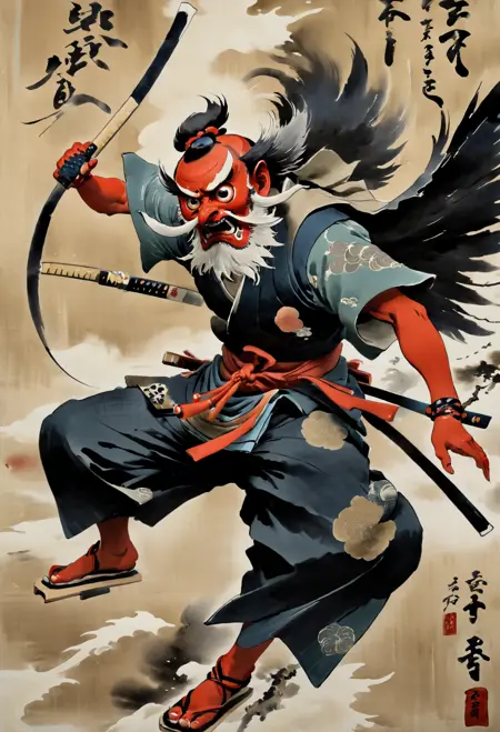 只有 tengu with long nose 和 crow tengu 似乎能稳定生效,而 tengu 也能足够好地生成叶天狗。在负面提示中加入 red beak 有助于抑制LoRa倾向于让叶天狗出现弯曲的鼻子,或让乌天狗出现红色鸟喙的倾向。需进行一些实验以获得最佳效果。