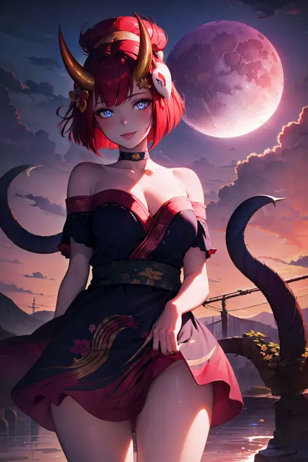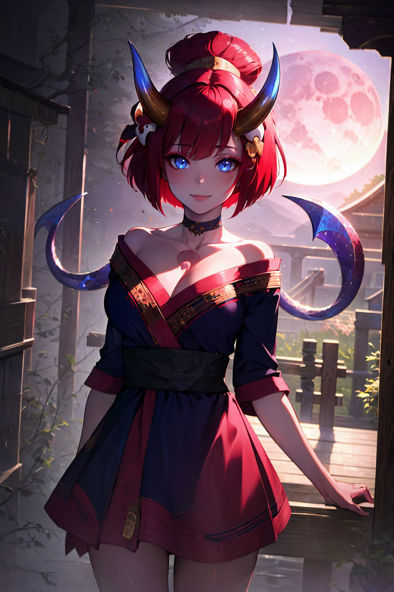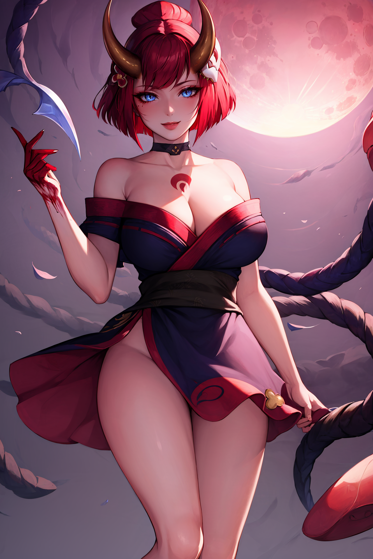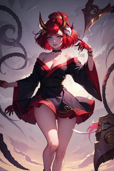 blood moon evelynn, 1girl, oni horns, japanese clothes, choker, cleavage, hair ornament, mask