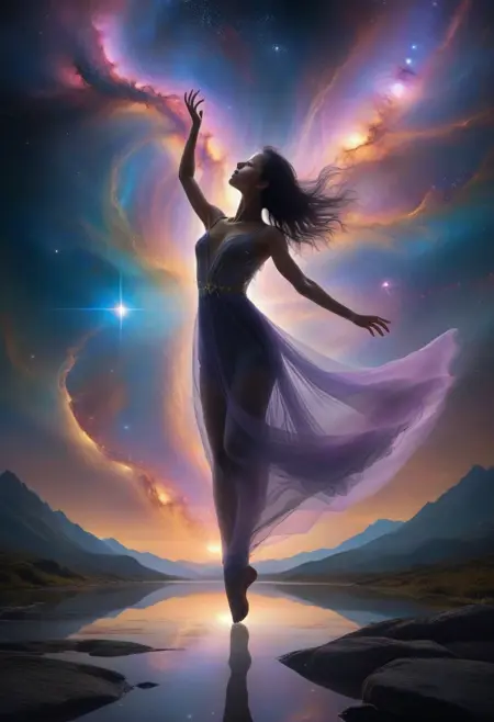 At the center of this kaleidoscopic realm, a figure emerges, embodying the essence of fantastical realism. Draped in garments that flutter and weave with the dream's fabric, the character stands amid a flourishing glade, where the trees are adorned with luminous blossoms and the waters sparkle with the light of stars. Fireflies dance around like living embers, and mythical creatures roam freely, their forms a blend of the familiar and the fantastically surreal.