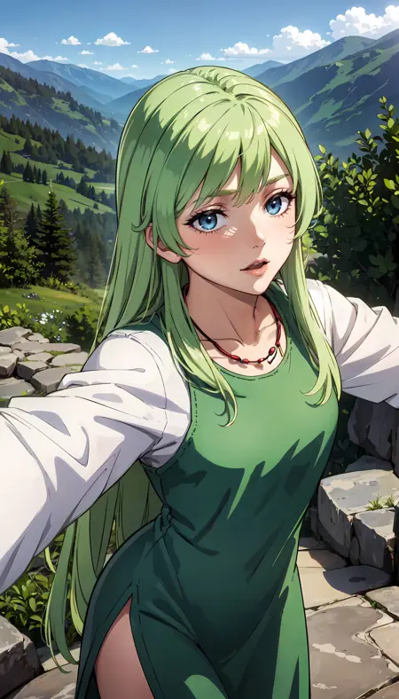 green dress, long dress, white sleeves, long hair, green hair, blue eyes, red necklace