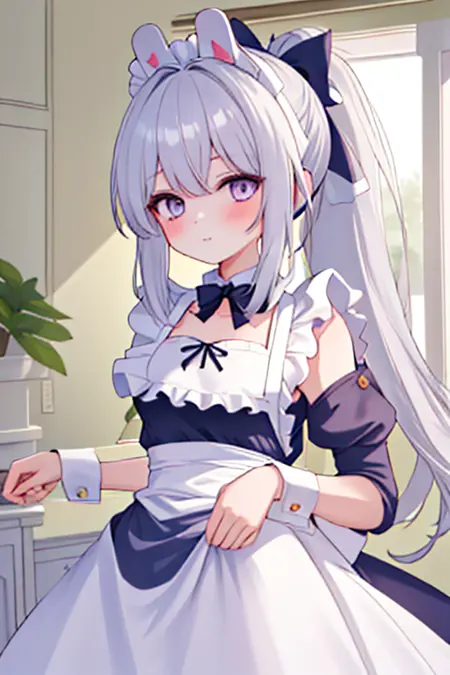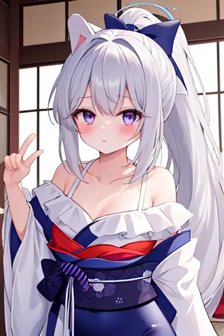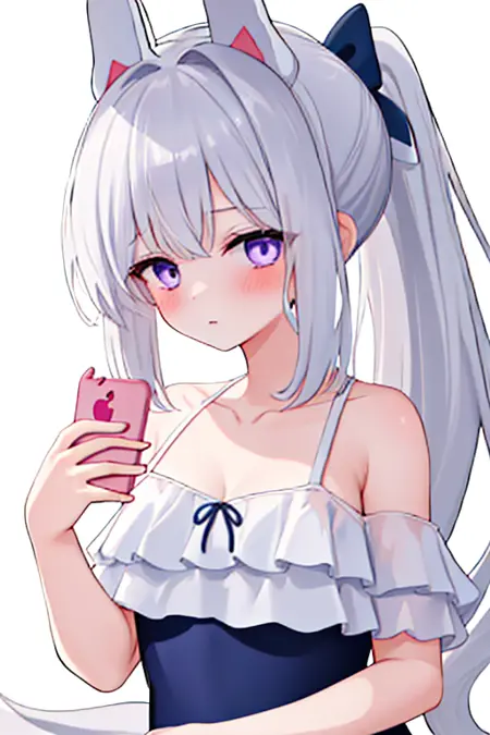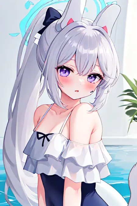 yuexuemiyako, and the recommended tags arebest quality, masterpiece, highres, solo, {yuexuemiyako:1.15}, long_hair, halo, white_hair, purple_eyes, blush, bangs, bow, hair_bow, swimsuit, one-piece_swimsuit, ponytail, breasts, animal_ears, grey_hair.. - Recommended weight is 0.5-1.15.