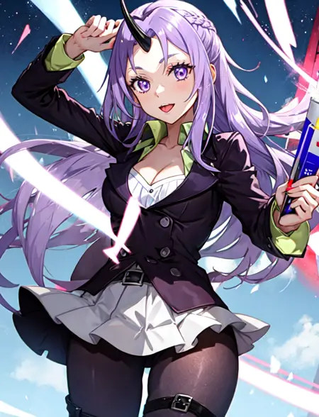 시온, 보라색 머리카락, 뿔, 큰 가슴