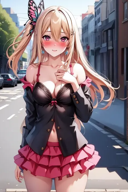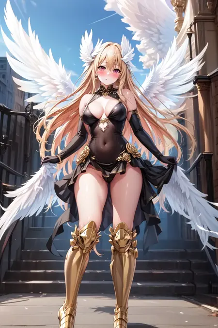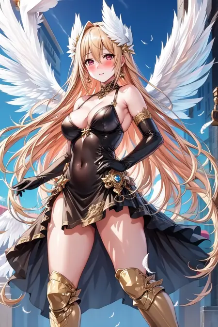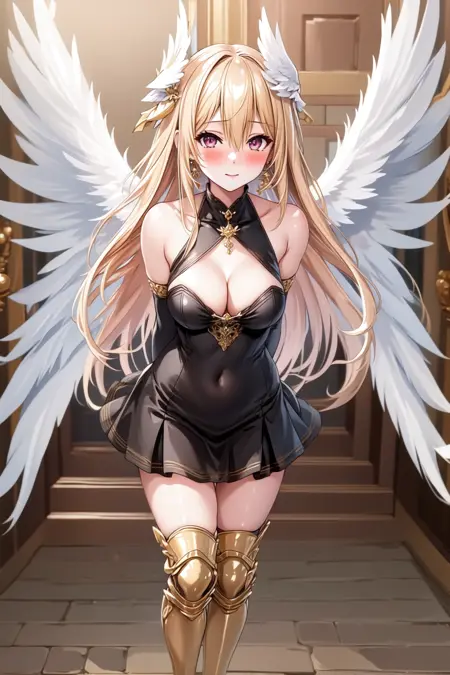 you can try Mayuri spirit form: blonde hair, long hair, hair between eyes, pink eyes, earrings, black dress, (black elbow gloves:1.2), cleavage cutout, navel, (angel white wings:1.3), (white feathered wings ornament:1.4), hair ornament, (golden armored knee boots:1.2), (golden ornament:1.2), intricate dress,