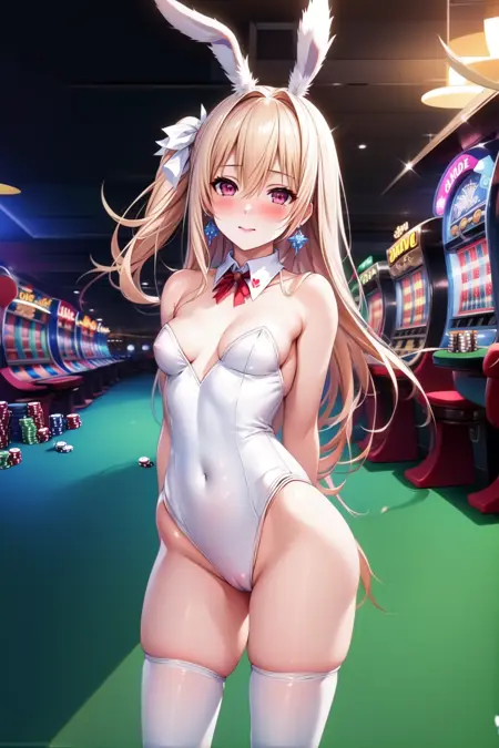 appearance: mayuri, blonde hair, long hair, hair between eyes, single side ponytail, pink eyes, white hair ribbon, earrings,
