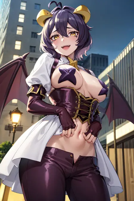 For the demon outfit use: utena2_wz,short hair, purple hair, ahoge, yellow eyes,+.+, hair between eyes, hair between eyes, demon wings, demon horns, pasties, fangs, demon girl, star pasties, puffy sleeves, purple elbow gloves, navel, purple pants, bat wings, crop top, corset