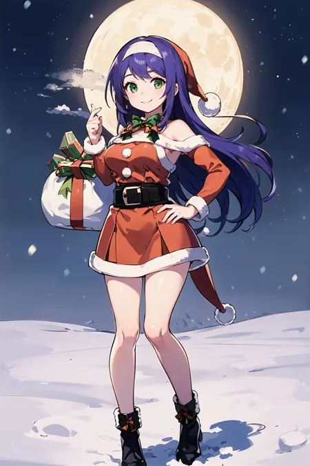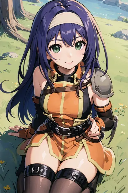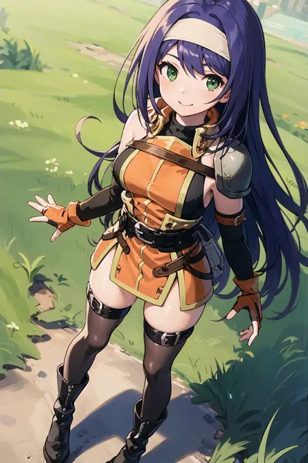 Add "long hair,ahoge,purple hair,green eyes,white hairband,shoulder armor,orange dress,sleeveless turtleneck, belt,fingerless gloves,thighhighs,boots" for her typical look.(default_XLv1.0)