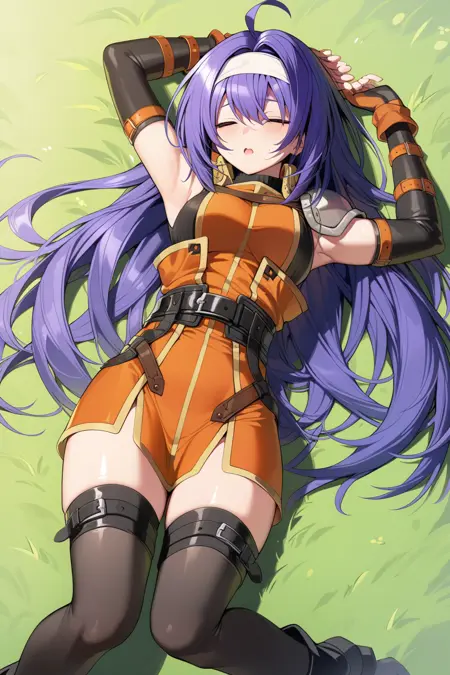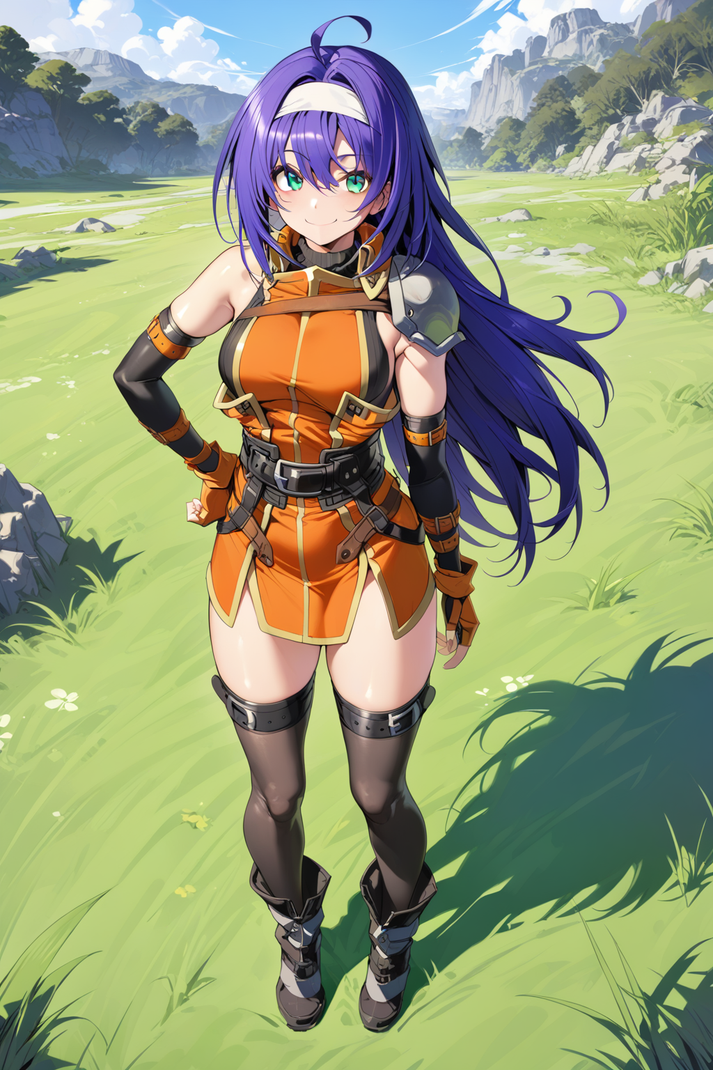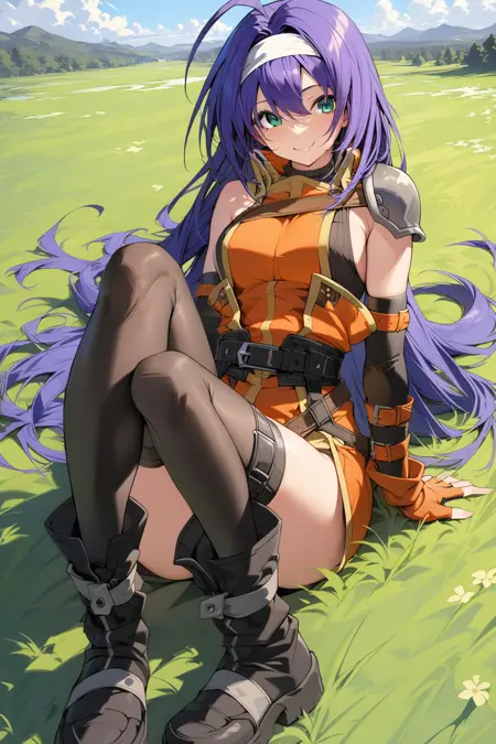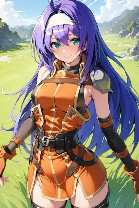 Add "long hair,ahoge,purple hair,green eyes,white hairband,shoulder armor,orange dress,sleeveless turtleneck, belt,fingerless gloves,thighhighs,boots" for her typical look.(default_XLv1.0)
