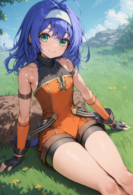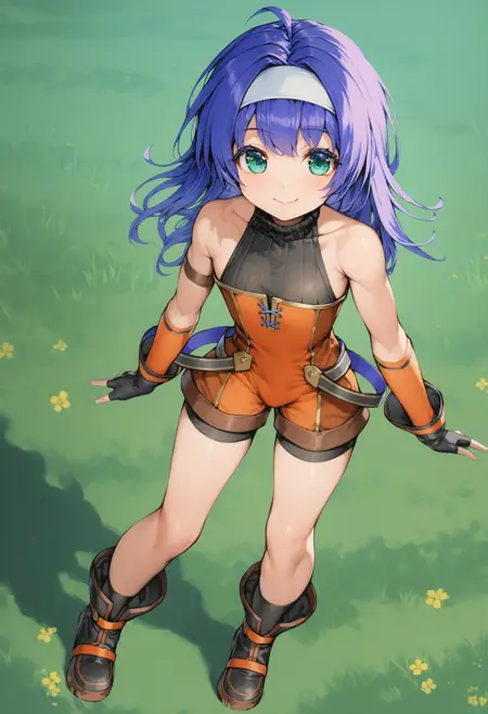 Add "long hair,ahoge,purple hair,green eyes,white hairband,shoulder armor,orange dress,sleeveless turtleneck, belt,fingerless gloves,thighhighs,boots" for her typical look.(default_XLv1.0)