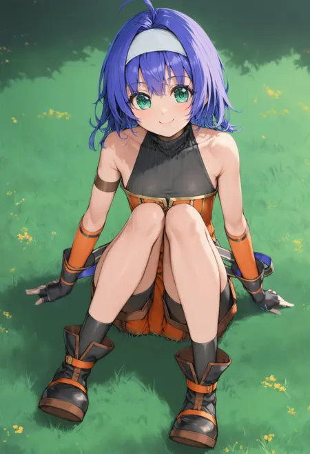 Add "white hairband,shoulder armor,orange dress,underwear,belt,fingerless gloves,thighhighs,boots" for her typical look.(default_1.5v1.0)