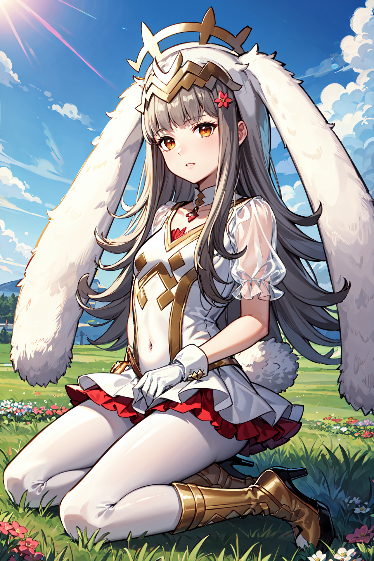 【봄 아우트핏】: spr_veronica, 흰 장갑, 흰 드레스, 흰 팬티스타킹, 하이힐, 볼륨 있는 짧은 소매, 짧은 드레스, 배꼽 가림, 토끼 꼬리, 꽃, 프릴, 옷 자름, 부츠, 투명 소매, 치마