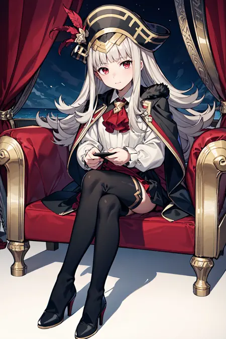 【해적 아우트핏】: pir_veronica, 흰 긴 소매, 애스콧, 허벅지 부츠, 허벅지 스타킹, 팬티스타킹, 어깨에 걸친 코트, 검은 신발, 검은 치마, 하이힐 부츠, 스카프, 드레스, 망토, 깃털, 금장식, 코트