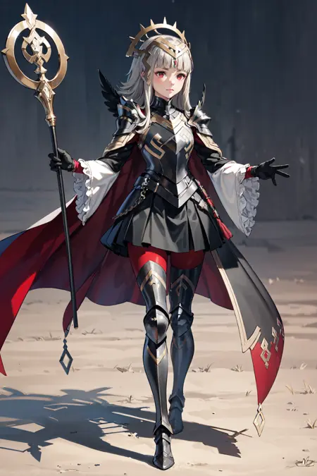 【브레이브 아우트핏】: bra_veronica, 검은 갑옷, 깃털, 망토, 검은 장갑, 빨간 팬티스타킹, 어깨 갑옷, 가슴판, 하이힐, 갑옷 부츠, 검은 긴 소매, 깃털 장식, 흰색 넓은 소매, 장갑, 검은 드레스, 허벅지 스타킹, 정강이 보호대, 검은 치마