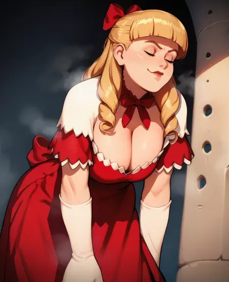 红色连衣裙,或裙子,或上衣,白色及肘手套,或白色手套,红色发带,或红色蝴蝶结,- 红色长裤,- 白色过膝袜,红色高跟鞋