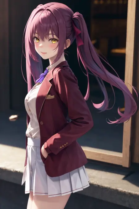 为更稳定地还原特征,请添加 黄色眼睛 紫色双马尾 白色裙子