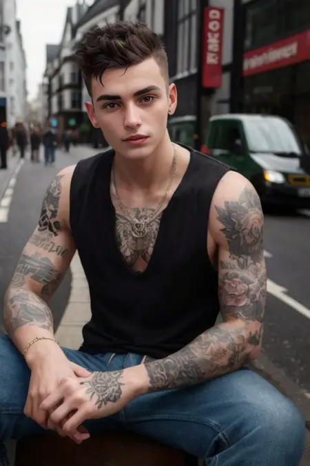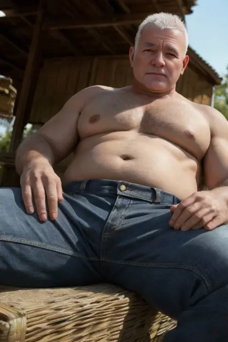(正面视角),超现实主义,(杰作),高细节,超真实,(一个[替换此处类型]男性),剃毛,坐着,双腿分开,穿着裤子,注视观众,Octan灯光,32K,近距离,模糊背景,[地点]