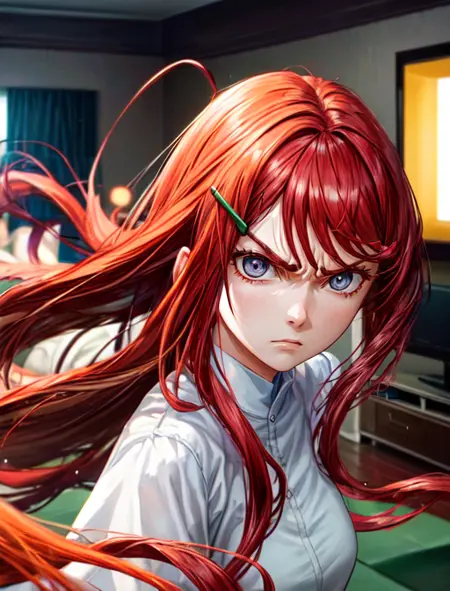 Additional words that may help: long hair, red hair, hair clip, [grey eyes: purple eyes: 0.75], mature woman