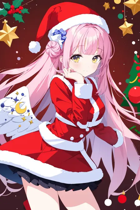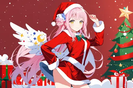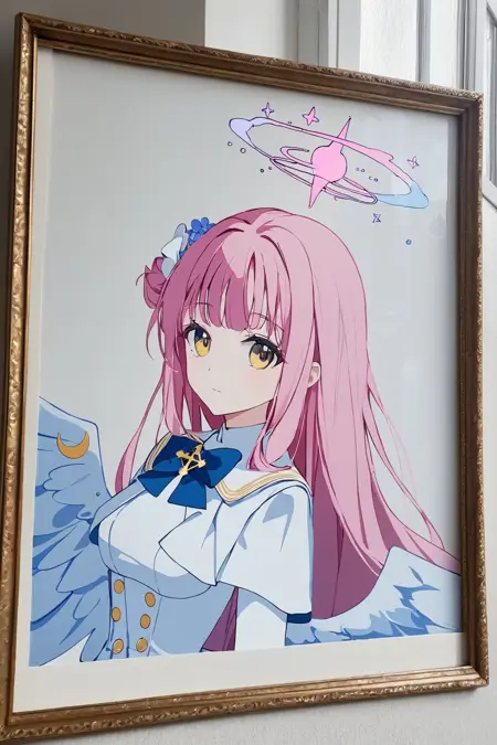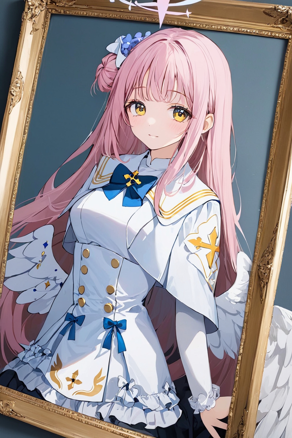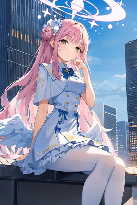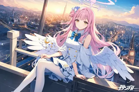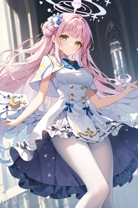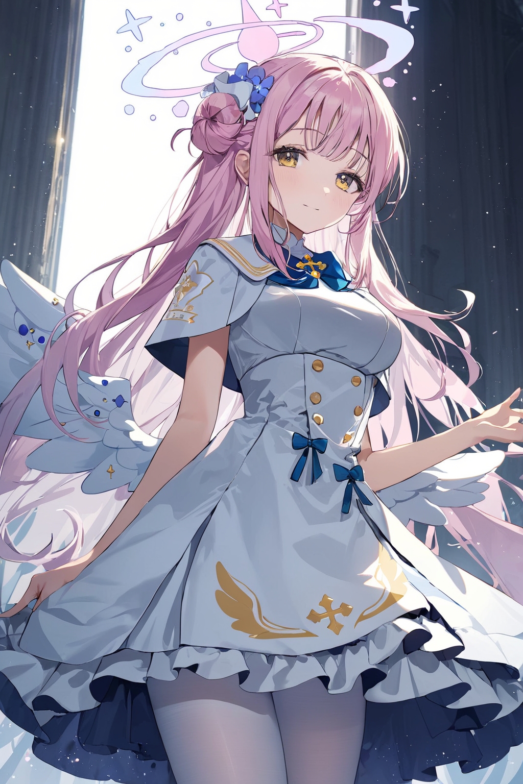 Other details also recommended. pink hair, yellow eyes, halo, white pantyhose, angel wings, underbust, ....
