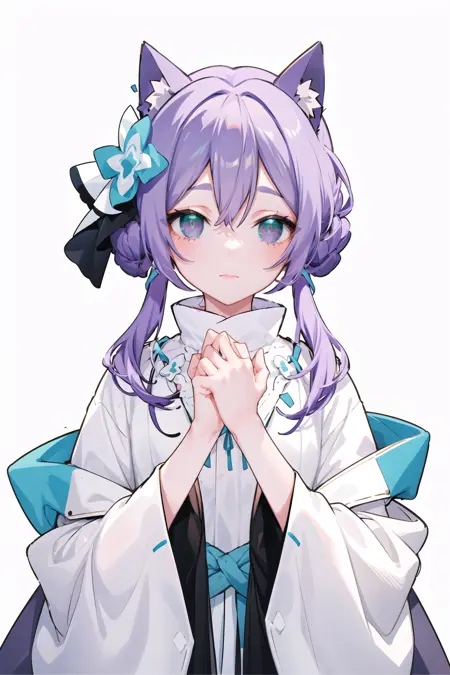 흰색 신발, 리본, 고양이 소녀, 보라색 눈, 동물 귀 털, 흰색 허벅지 양말, 흰색 드레스, 다색 눈, 보라색 눈, 녹색 동공, 눈 사이 머리카락, 분리된 소매, 긴 소매, 넓은 소매, 등불 들고 있음, 파란 리본, 흰색 드레스, 녹색 동공, 트윈테일, 두꺼운 눈썹, 흰색 셔츠, 파란 코트, 소매 없는 셔츠, 가슴 보석, 벌거벗은 어깨, 발목 고정대,