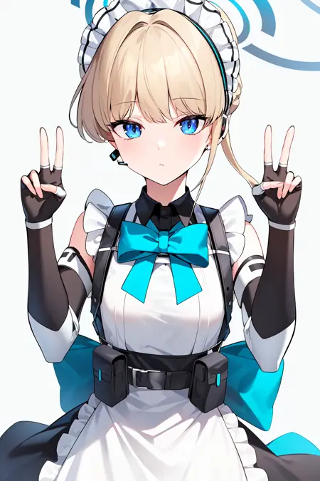 메이드 복장을 프롬프트하려면 "lora:TokiBAv1:strengthtoki, halo, short hair, maid headdress, maid apron dress, detached sleeves, thigh strap, fingerless gloves, earpiece, chest harness, waist bow,"를 입력하세요.