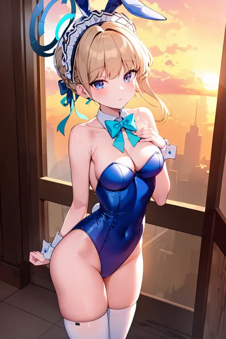 토끼 소녀 복장을 프롬프트하려면 "lora:TokiBAv1:strengthtoki, halo, long hair, rabbit ears, detached collar bowtie, playboy bunny leotard, white thighhighs, bunny tail, earpiece, earrings, hair ribbon, wrist cuffs, blue high heels,"를 입력하세요.