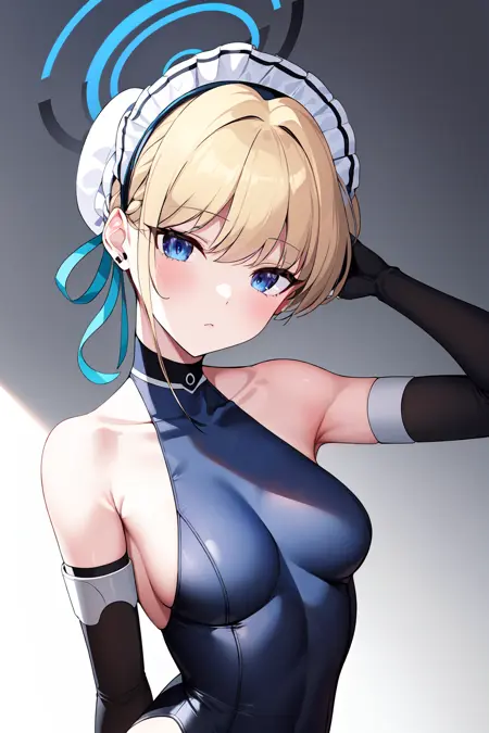 일반 레오타드 복장을 프롬프트하려면 "lora:TokiBAv1:strengthtoki, halo, short hair, navy leotard, maid headdress, detached sleeves, white boots, fingerless gloves,"를 입력하세요.