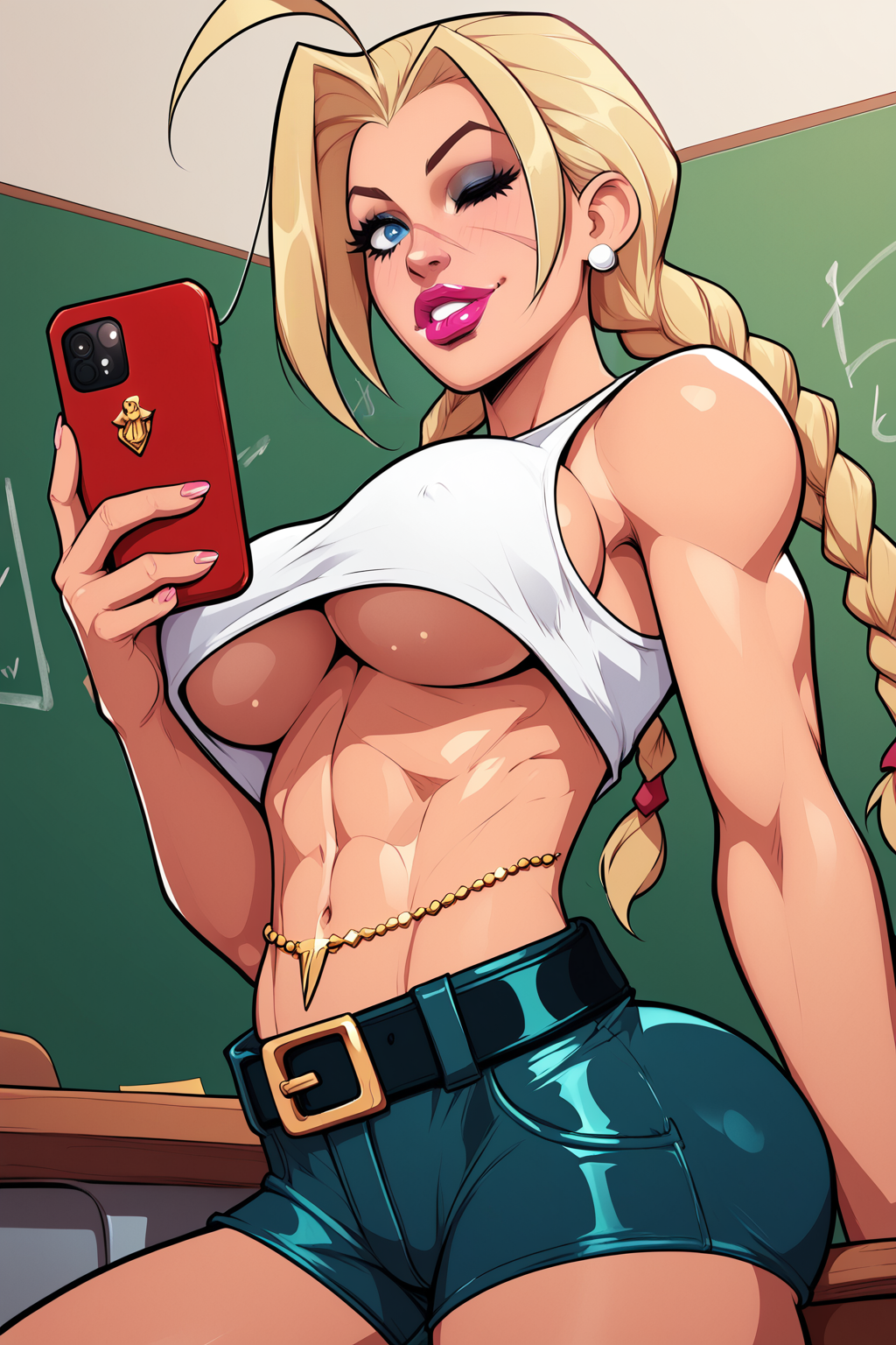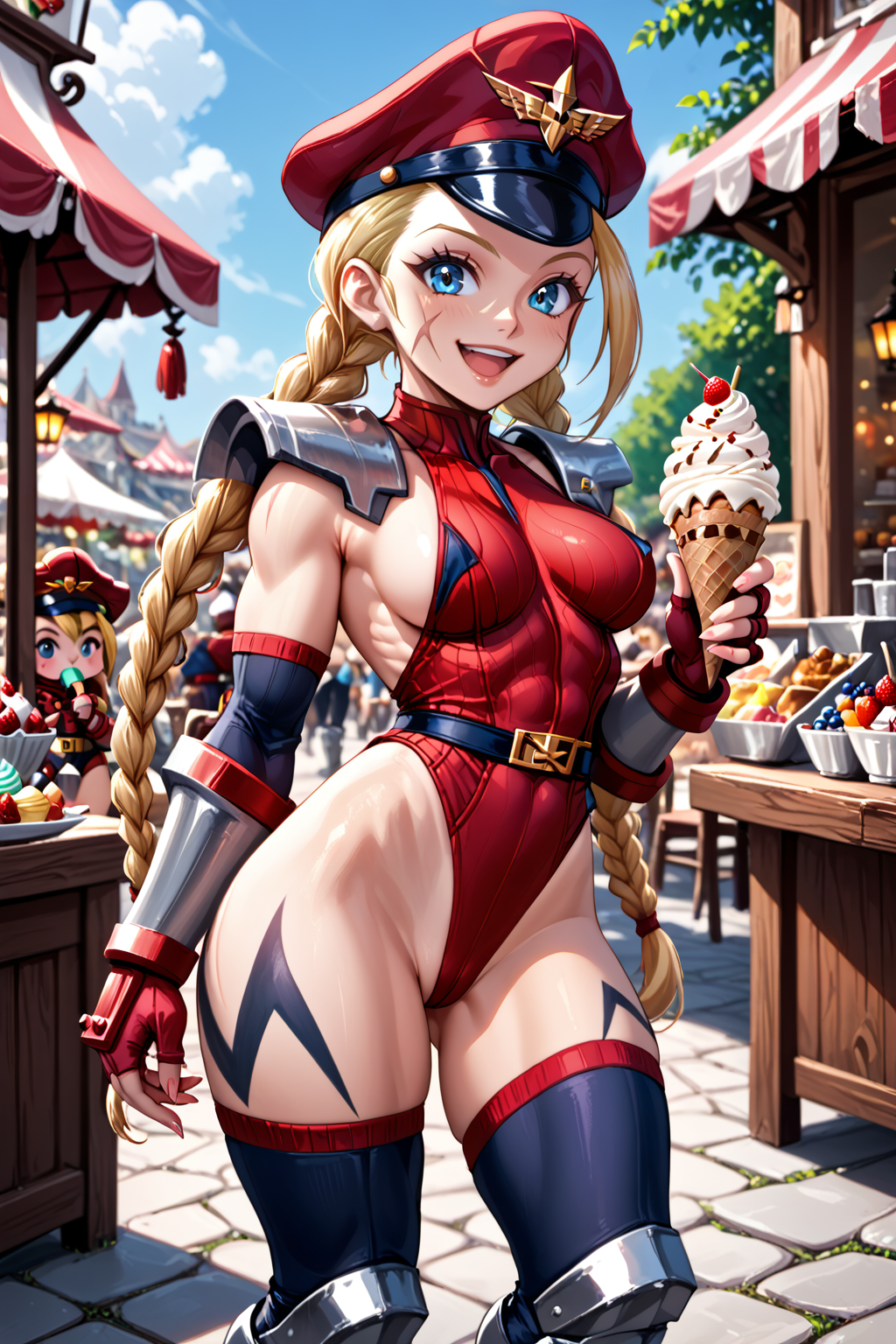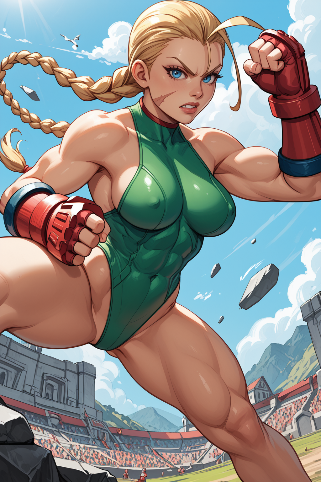 Trigger : evlcmmy, toned, twin braids, ahoge, peaked cap, scar on cheek, pauldrons, thong leotard, highleg leotard, bracer, fingerless gloves, sideboob, bodypaint, thighhighs, armored boots