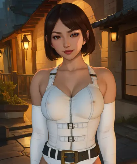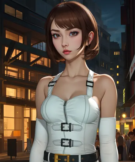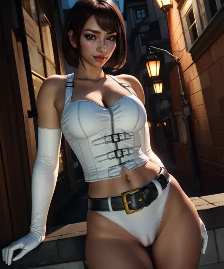 white elbow gloves, belt, - white corset, or white top, bare shoulders, - cleavage, - navel, or midriff, - thigh boots, shorts, or underwear, - gold trim,