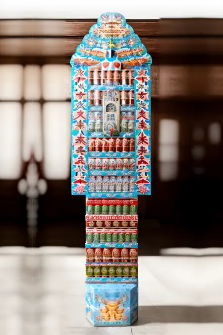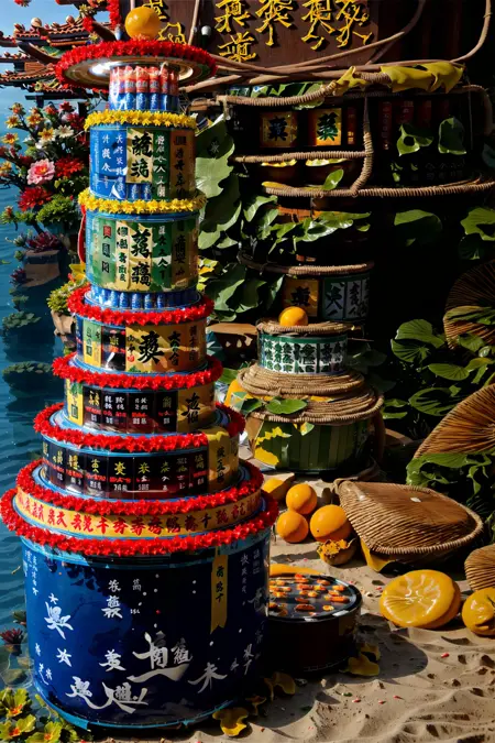 根据供品的种类不同,名称也各异,其中以易拉罐或罐头食品层层堆叠而成的,被称为“罐头塔”。