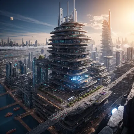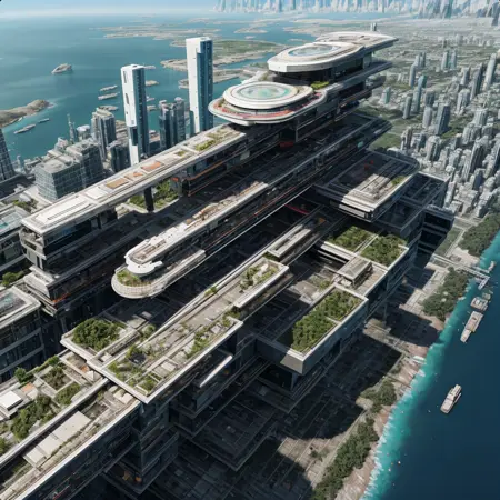 This model represents an imagination of a future city, dominated by light-colored landmarks and accompanied by a handful of aircraft.
