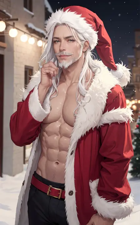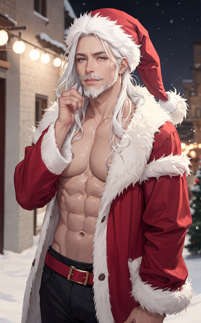 • 1boy, blue eyes, white hair, long hair, very long hair, beard, facial hair, mature male, mustache, old man, santa hat, bare pectorals, large pectorals, muscular male, abs, nipples, manly, bara,