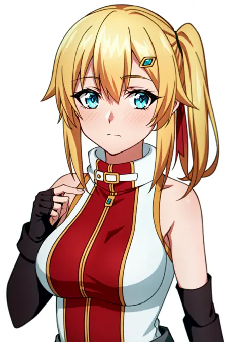 Emma Brightness, 1girl, solo, blonde hair, gloves, skirt, fingerless gloves, side ponytail, breasts, looking at viewer, full body, blush, large breasts, white background, blue eyes, simple background, hair ornament, boots, hairclip