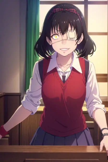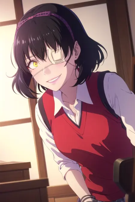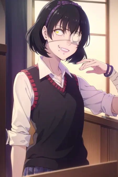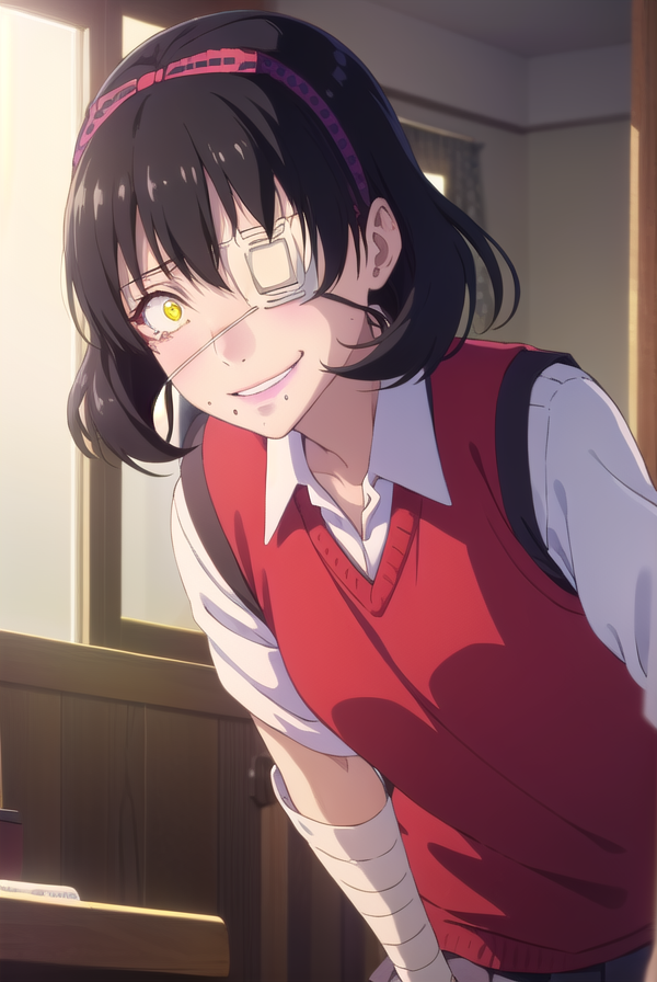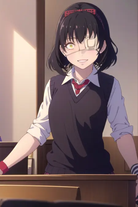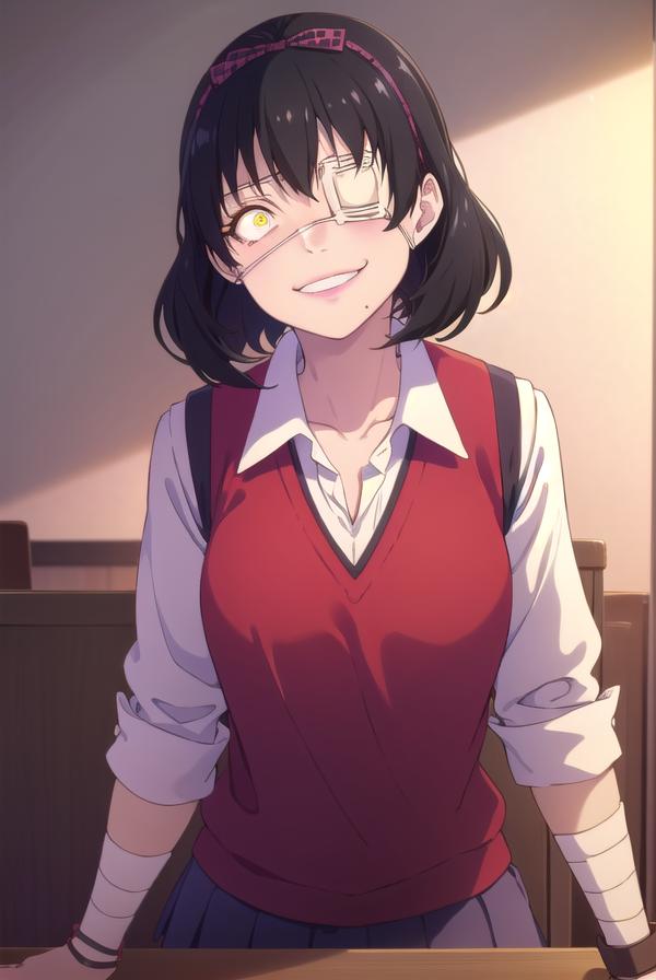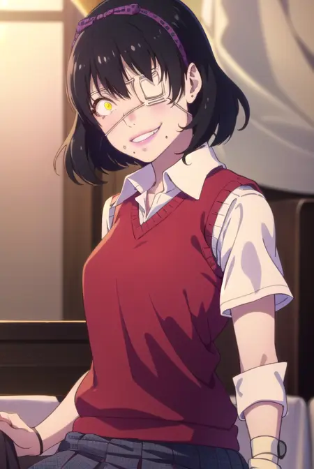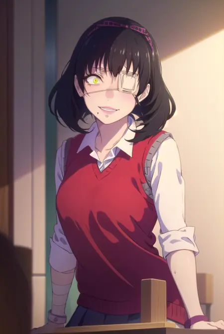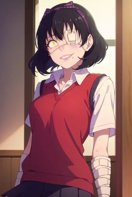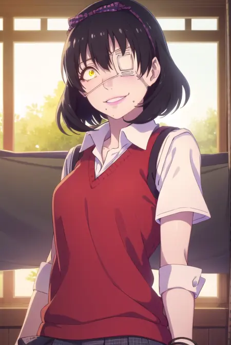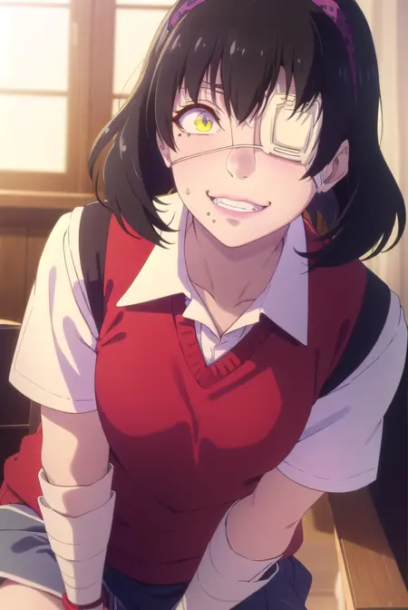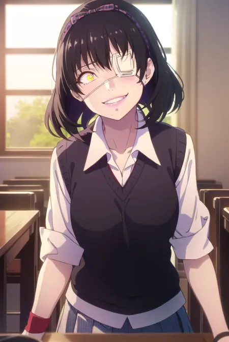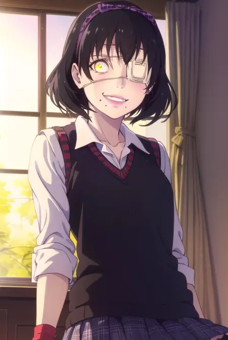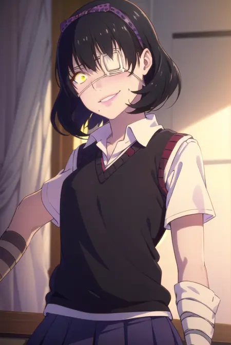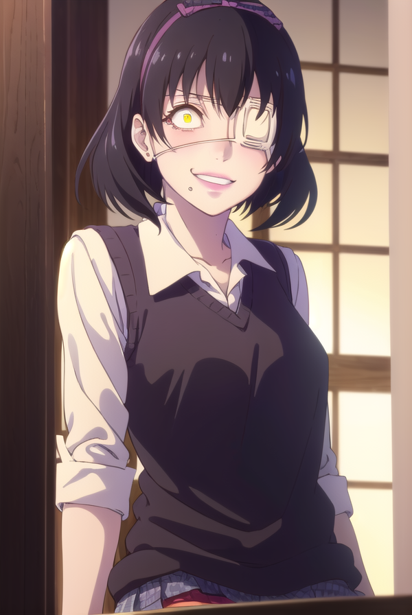 midari ikishima, short hair, black hair, hairband, mole, (eyepatch:1.5), mole under mouth, smile, (yellow eyes:1.2),