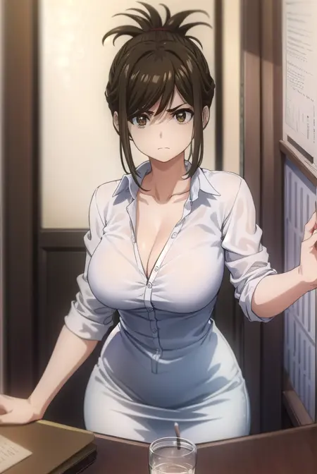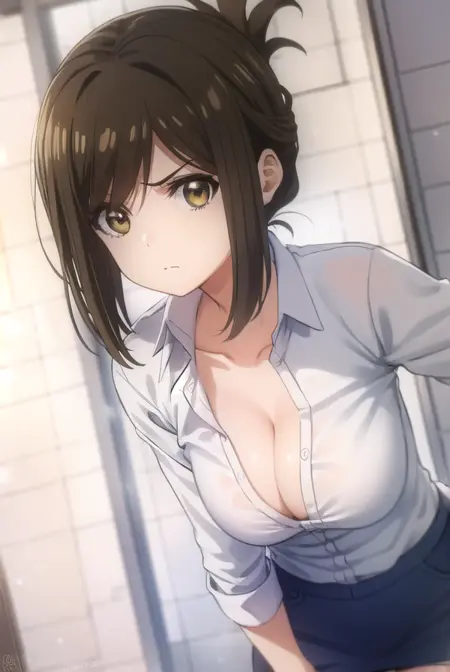 카나 코지마, 갈색 머리카락, (갈색 눈:1.5), 접힌 포니테일,