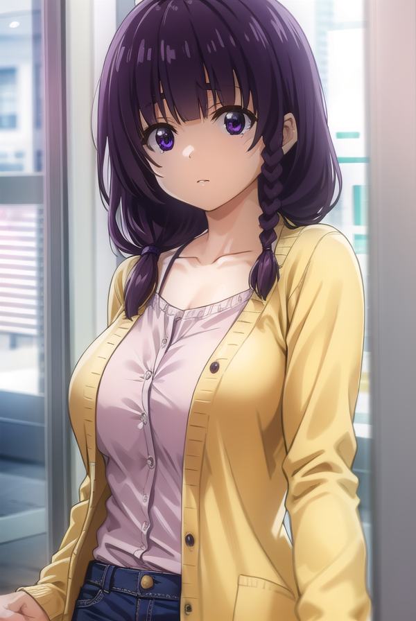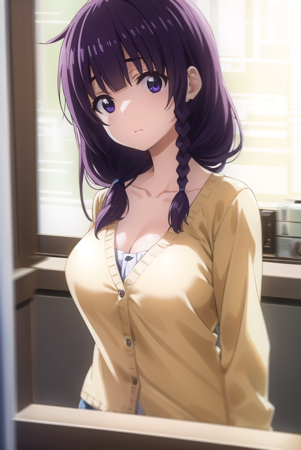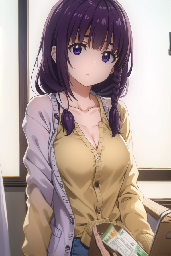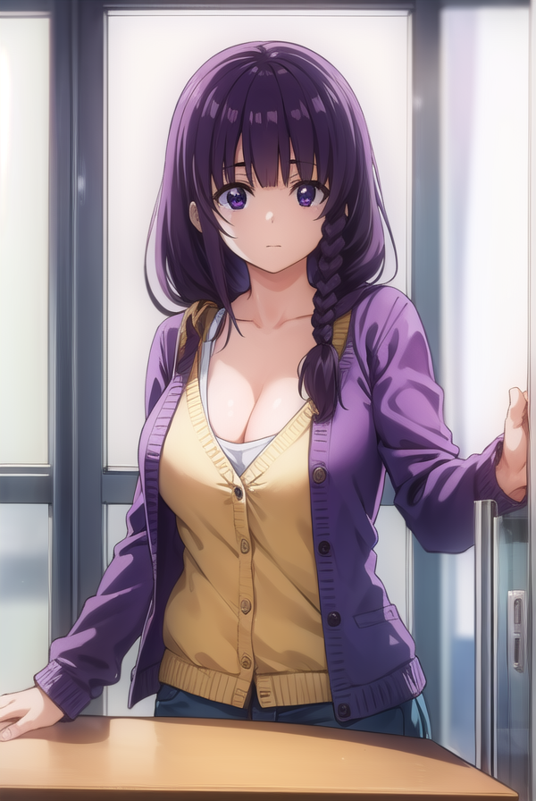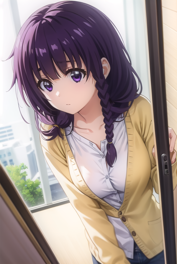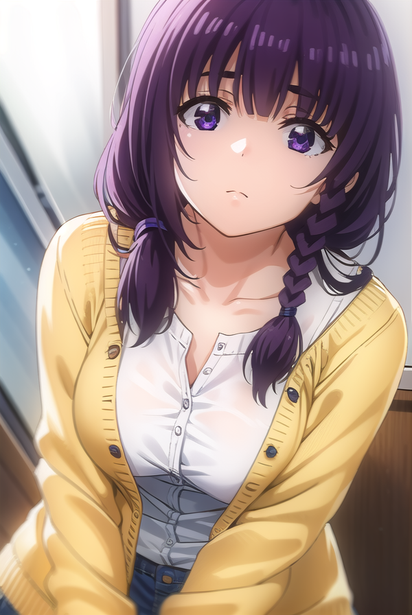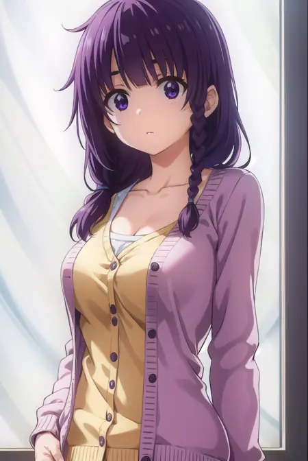 mayu matsukaze、長い髪、前髪、紫髪、(紫の目:1.1)、編み込み、片側編み込み、肩にかかる髪