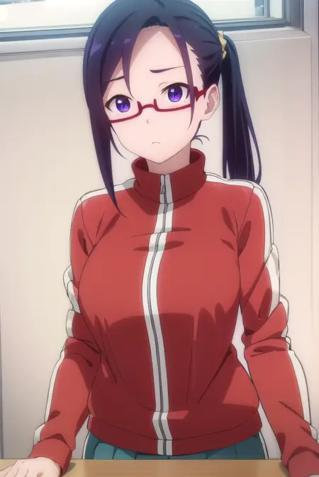 ポニーテール、ジャケット、トラックジャケット、トラックスーツ、(赤いジャケット:1.3)、オープンな服、シャツ、青いシャツ、鎖骨、(胸元:1.5)、