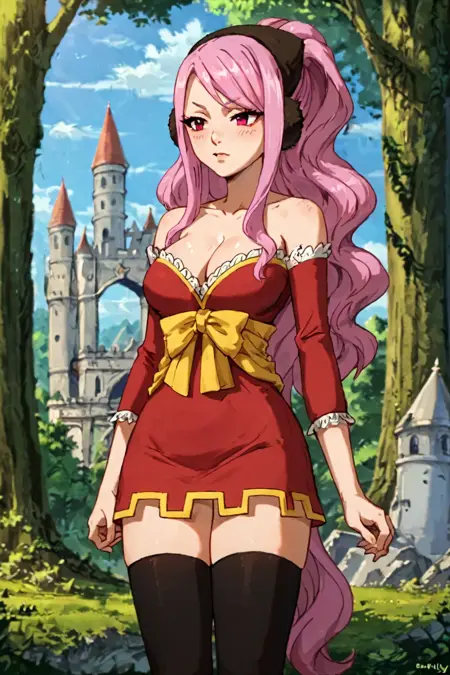 如果你想生成动画中的Meredy:meredy76, red dress, short dress, yellow ribbon, ear muffs, pony tails, pink hair, detached sleeves, off shoulder, aqua eyes, medieval, fantasy, black stockings, brown boots, cleavage,