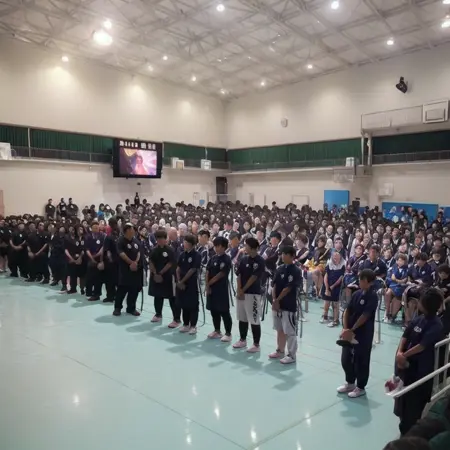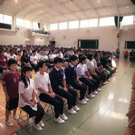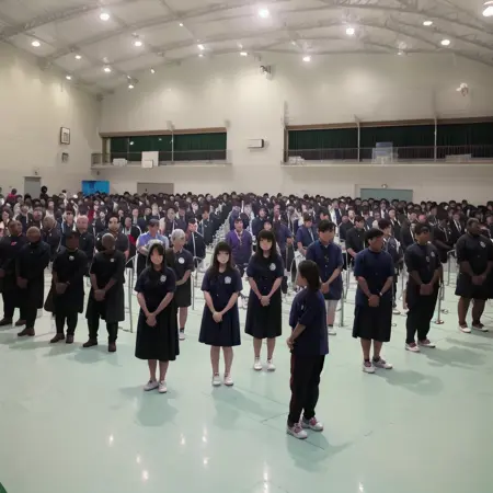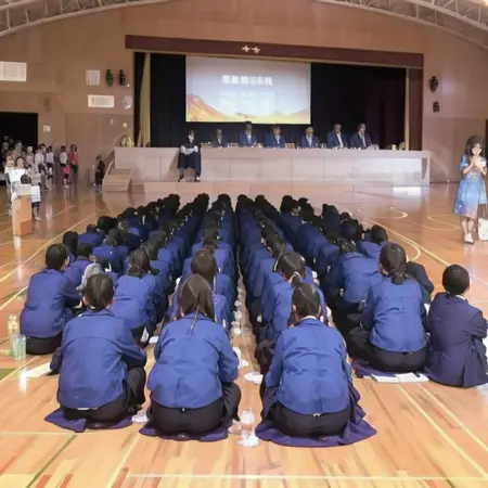 3 Scene of the meeting at the gymnasium / 体育館での集会風景 (Japanese schools frequently hold assemblies in which students are lined up in the schoolyard or gymnasium to talk. / 日本の学校では校庭や体育館に生徒を整列させて話をする集会が頻繁に開催されます。)