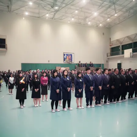 shikiten, taiikukan, 6+boys, japan, multiple boys, indoors, japanese flag, crowd, school uniform, curtains, chair, 6+girls