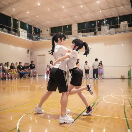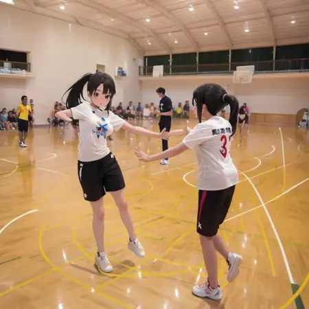 taiikukan, indoors, multiple girls, sportswear, shorts, shoes, black hair, walking, sneakers, basketball uniform, standing, short hair,