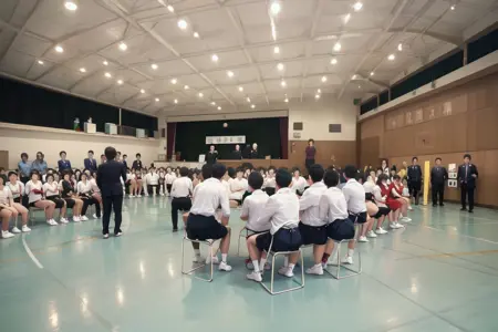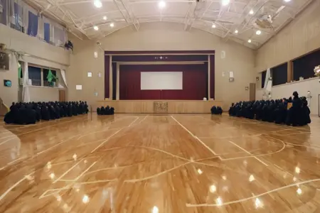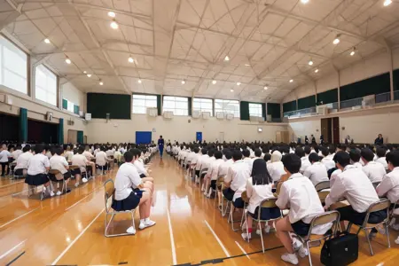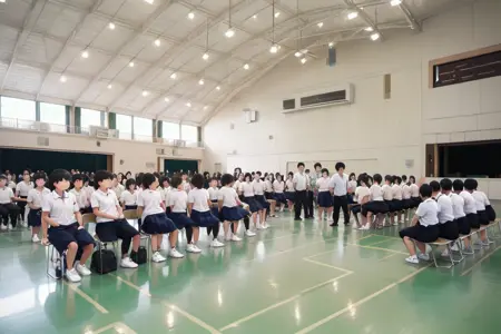 3 Scene of the meeting at the gymnasium / 体育館での集会風景 (Japanese schools frequently hold assemblies in which students are lined up in the schoolyard or gymnasium to talk. / 日本の学校では校庭や体育館に生徒を整列させて話をする集会が頻繁に開催されます。)