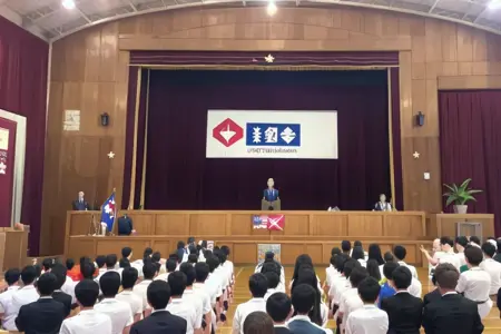 shikiten, taiikukan, 6+boys, japan, multiple boys, indoors, japanese flag, crowd, school uniform, curtains, chair, 6+girls