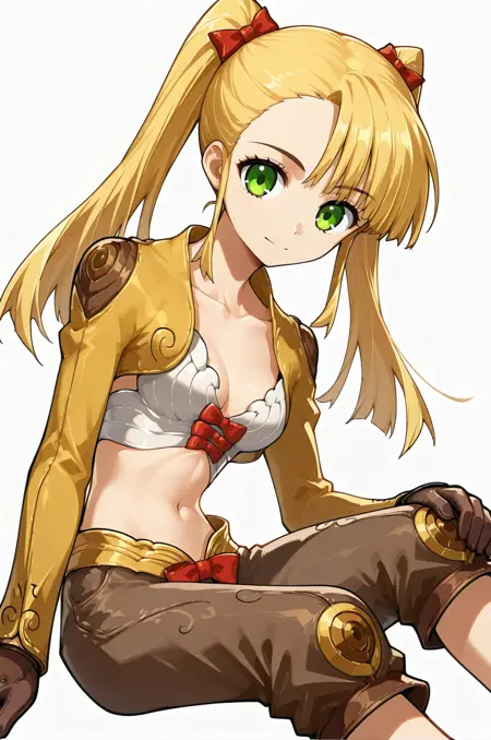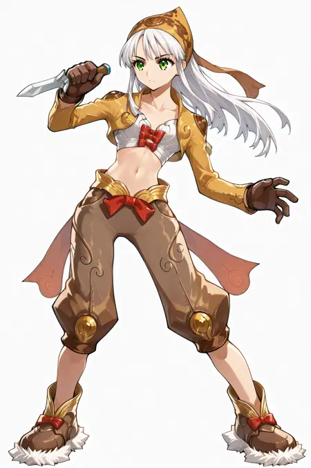 prompt: thiefRO, gloves, midriff, navel, brown pants, yellow clothes, red ribbon