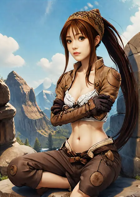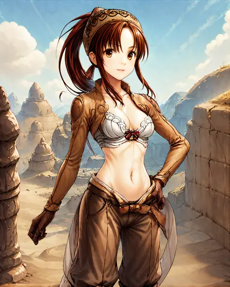 prompt: thiefRO, brown gloves, midriff, navel, brown capri pants, clothes, long sleeve