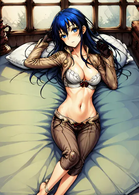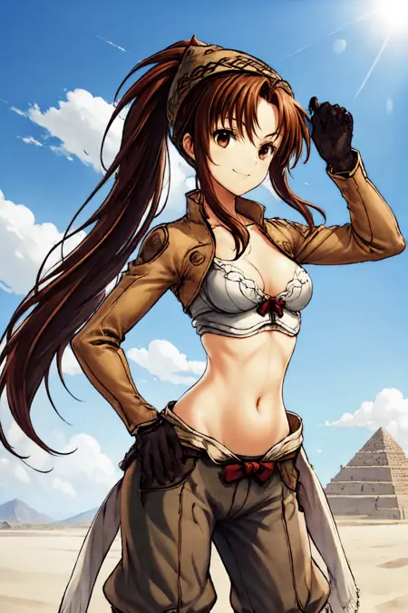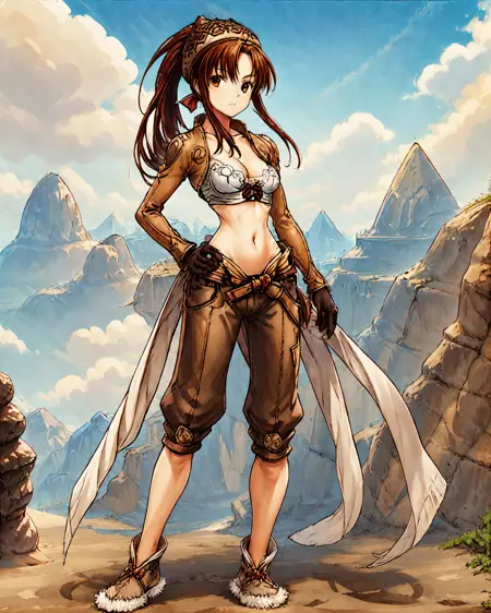 prompt: thiefRO, brown gloves, midriff, navel, brown capri pants, clothes, long sleeve