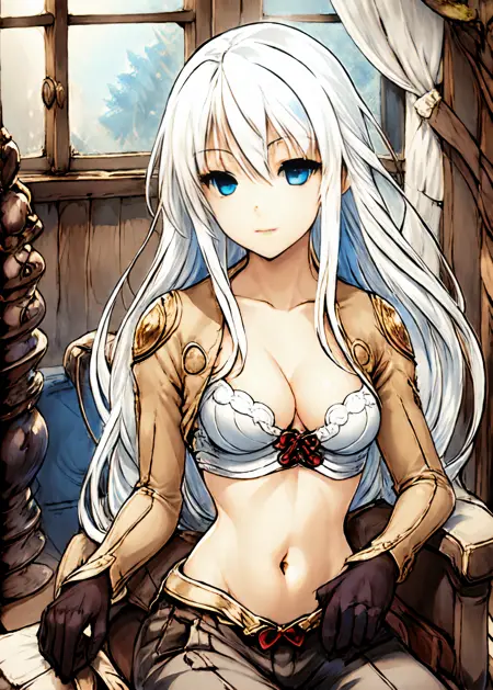 prompt: thiefRO, brown gloves, midriff, navel, capri pants, collarbone, cropped jacket, long sleeve, crop top, white bra, boots