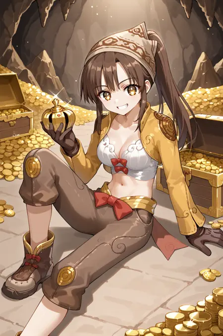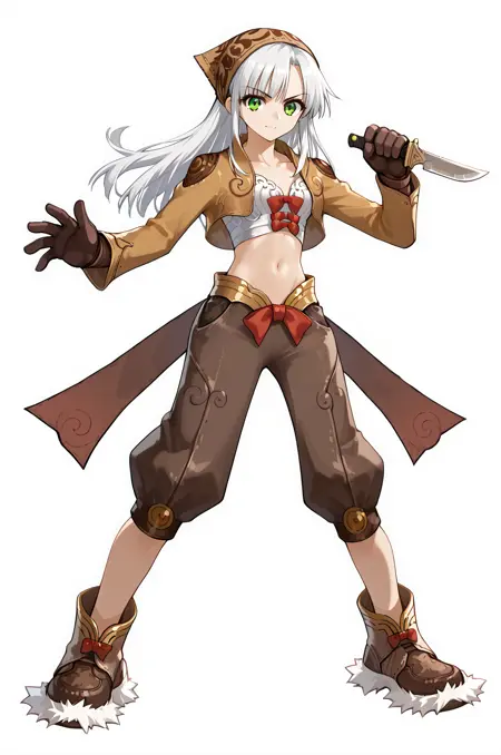 prompt: thiefRO, brown gloves, midriff, navel, brown capri pants, clothes, long sleeve