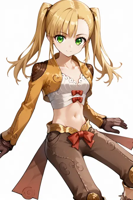 prompt: thiefRO, gloves, midriff, navel, brown pants, yellow clothes, red ribbon