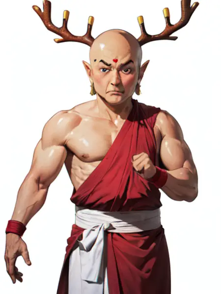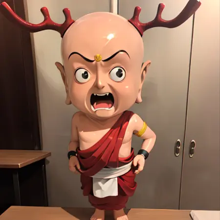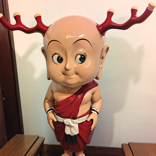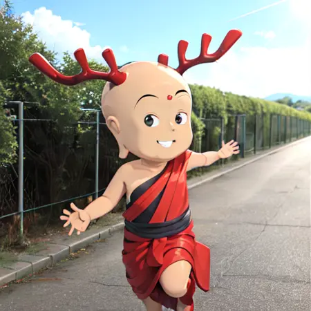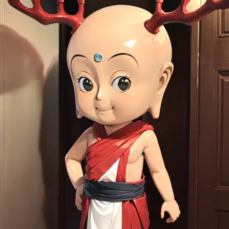 prompt : sentokun,1boy,chibi, child, monk,shaved head, big head, deer horns, pointy ears, robe,single bare shoulder,bare arms