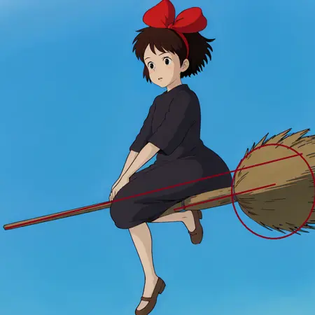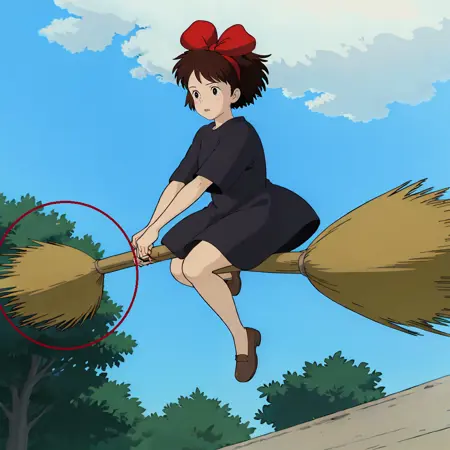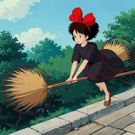 In the image of riding a broom created using Kiki's data, the broom axes intersect, and broom tassels appear in the front and back.